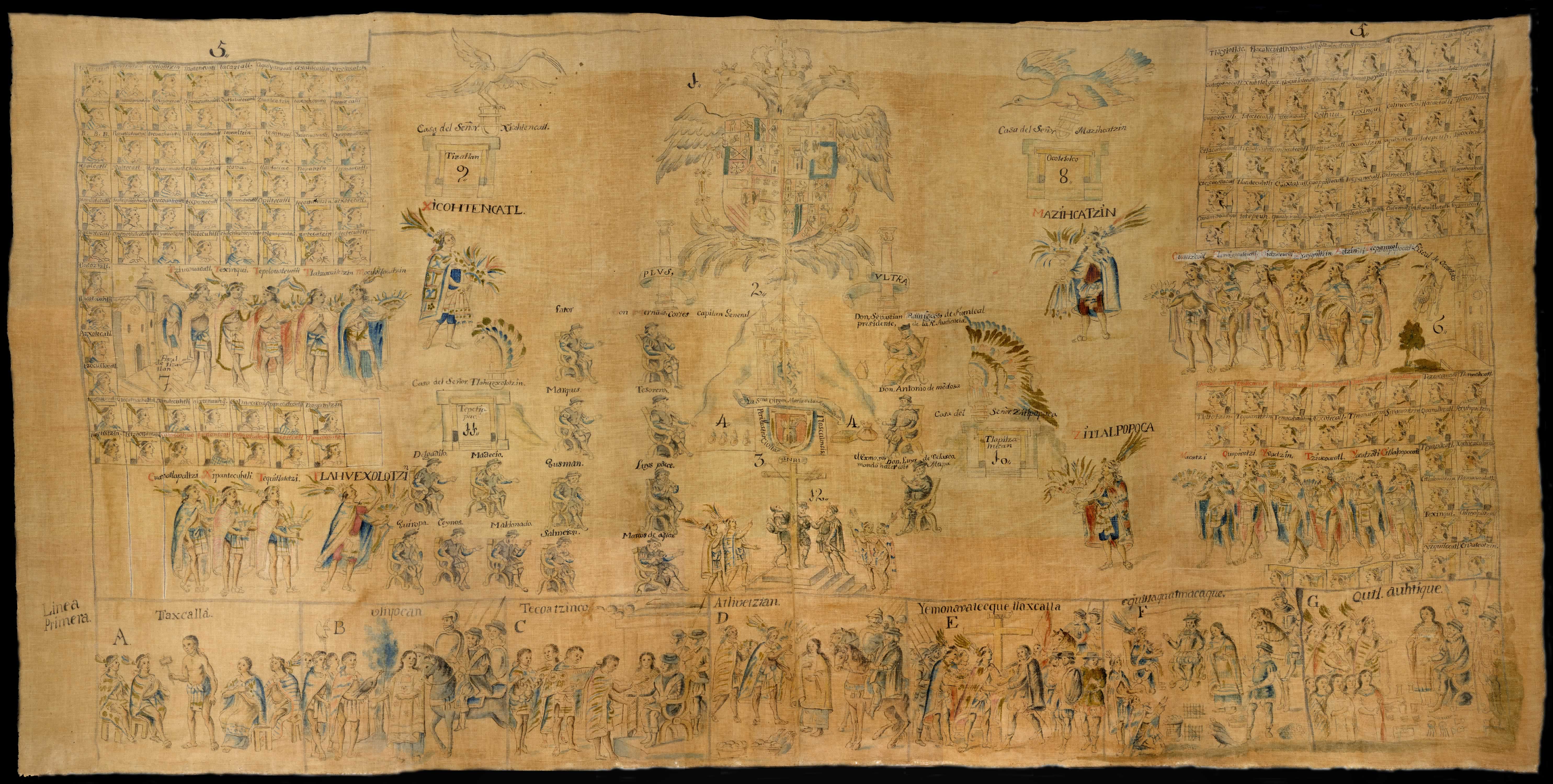 Historia: Al parecer se elaboraron tres originales de este lienzo: uno fue enviado a España para Felipe II, el segundo permaneció en Tlaxcala y el tercero se mandó a la ciudad de México. Actualmente se desconoce su paradero. Las copias que se conservan están incompletas: entre ellas destaca la de José Manuel Yllañes elaborada en 1773 y que resguarda la Biblioteca Nacional de Antropología e Historia.